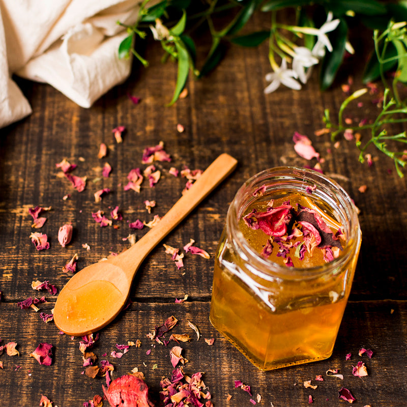 Hergestellt aus Bienenhonig und Rosenblättern.
